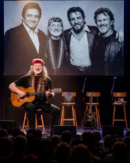 Low harmonies seemed to rise from the microphones positioned in front of the empty chairs. Not loudly. Not clearly. Just enough to feel familiar. The blend sat beneath Willie’s voice, not competing with it, but supporting it—like memory filling in what time has taken away.