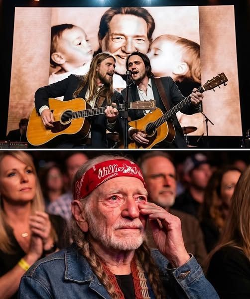 Without announcement or explanation, Lukas Nelson and Micah Nelson appeared side by side. No speeches. No gestures toward legacy. Just two sons standing close enough to share breath, delivering a duet so raw it felt as if time itself paused.